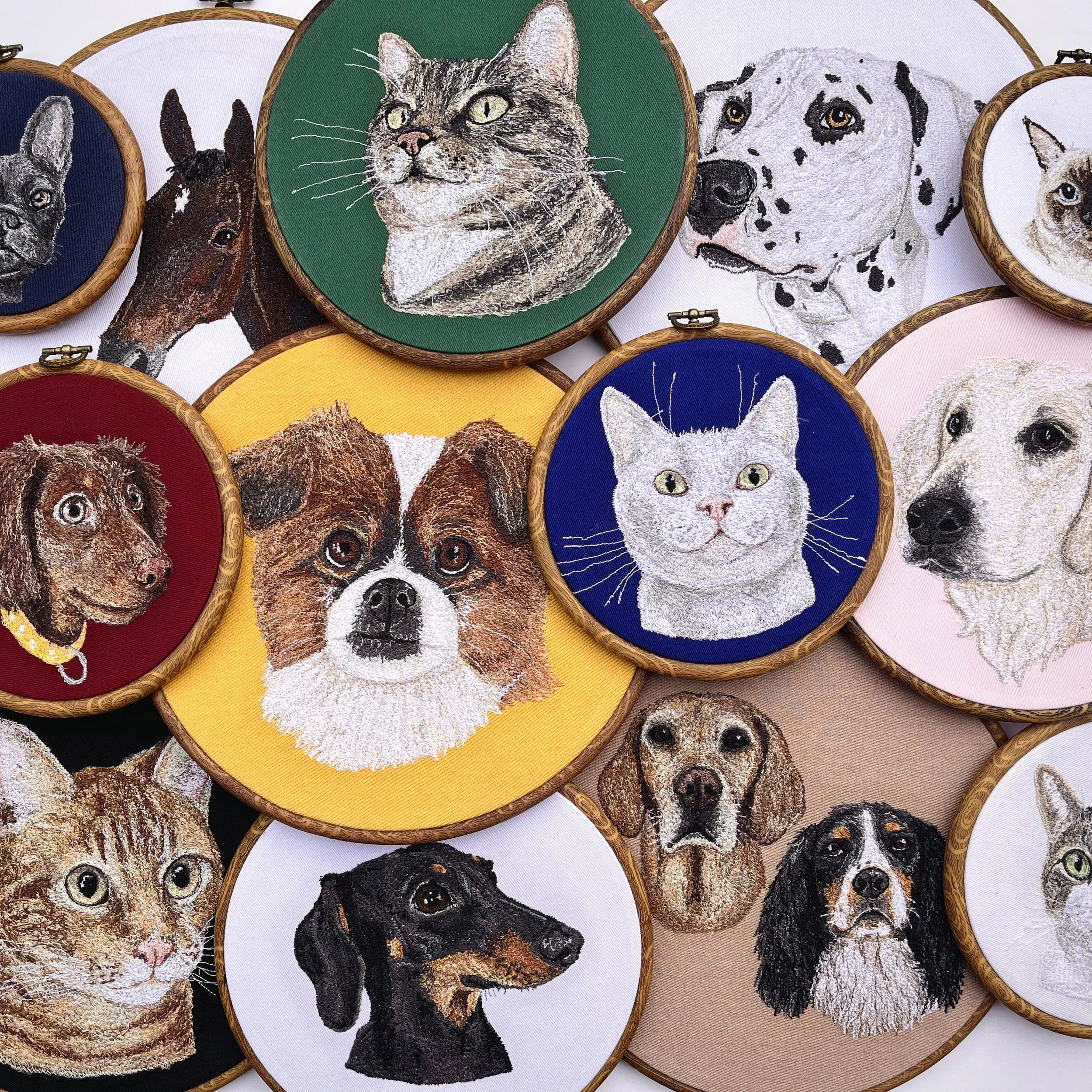 I create custom made embroidered hoops of your lovable creatures, here are a few examples of recent work. Each size hoop ranges in detail but every size is as rewarding.